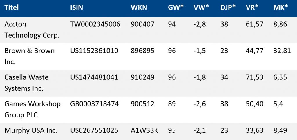 Im April 2025 wurde zudem die Quartalsprüfung der Aktienkennzahlen durchgeführt, die in einem Austausch von 5 Titeln resultierte. Nachfolgend werden die neuen Aktien mit Ihren entsprechenden Kennzahlen präsentiert.