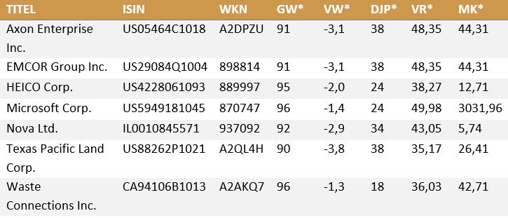 Im Januar 2025 wurde zudem die Quartalsprüfung der Aktienkennzahlen durchgeführt, die in einem Austausch von 7 Titeln resultierte. Nachfolgend werden die neuen Aktien mit Ihren entsprechenden Kennzahlen präsentiert.