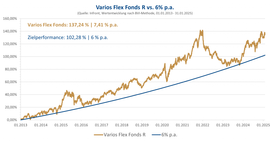 Varios Flex Fonds R vs. 6%-Zielmarke (01.01.2013 bis 31.01.2025)
