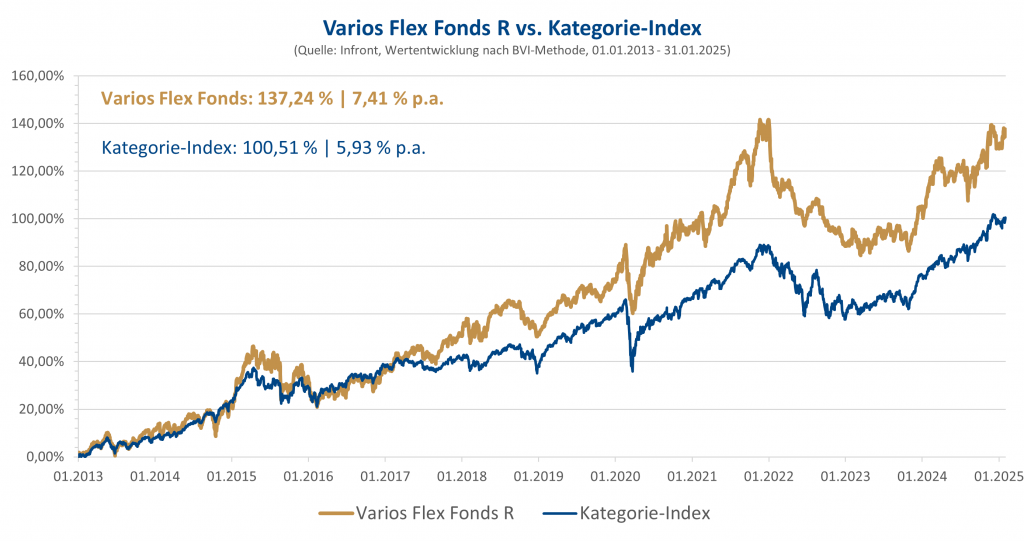 Varios Flex Fonds R vs. Kategorie-Index (01.01.2013 bis 31.01.2025)