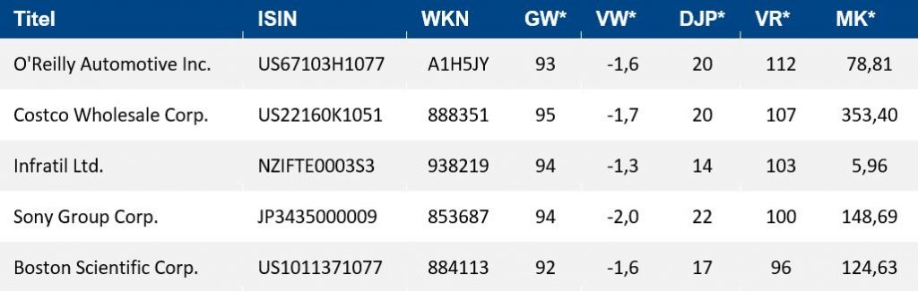 Im Oktober 2025 wurde zudem die Quartalsprüfung der Aktienkennzahlen durchgeführt, die in einem Austausch von 5 Titeln resultierte. Nachfolgend werden die neuen Aktien mit Ihren entsprechenden Kennzahlen präsentiert.