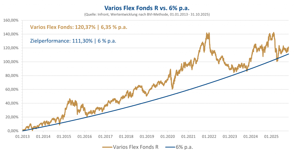 Varios Flex Fonds R vs. 6%-Zielmarke (01.01.2013 bis 31.10.2025)