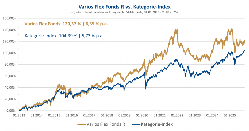 Varios Flex Fonds R vs. Kategorie-Index (01.01.2013 bis 31.10.2025)